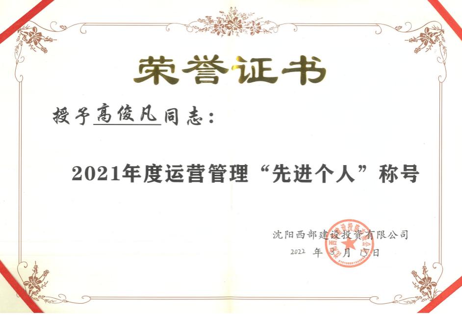 自2021年3月起,高俊凡在中铁三局集团有限公司中德产业园项目经理部运维部负责运营道路维护管理工作。他严格要求自己,认真钻研技术技能,工作积极主动,赢得了同事和领导的一致好评。他的努力与付出得到了应有的回报。在工作期间,他荣获甲方单位沈阳西部建设投资有限公司评选的2021年度运营管理“先进个人”称号、中铁三局集团有限公司运输工程分公司第五工程段2021年度“优秀员工”称号、中铁三局集团有限公司运输工程分公司第五工程段2022年度“优秀技能人才”称号和2023年度“先进个人”等,这些荣誉不仅是对他个人能力的肯定,更是对他辛勤付出的最好回报。